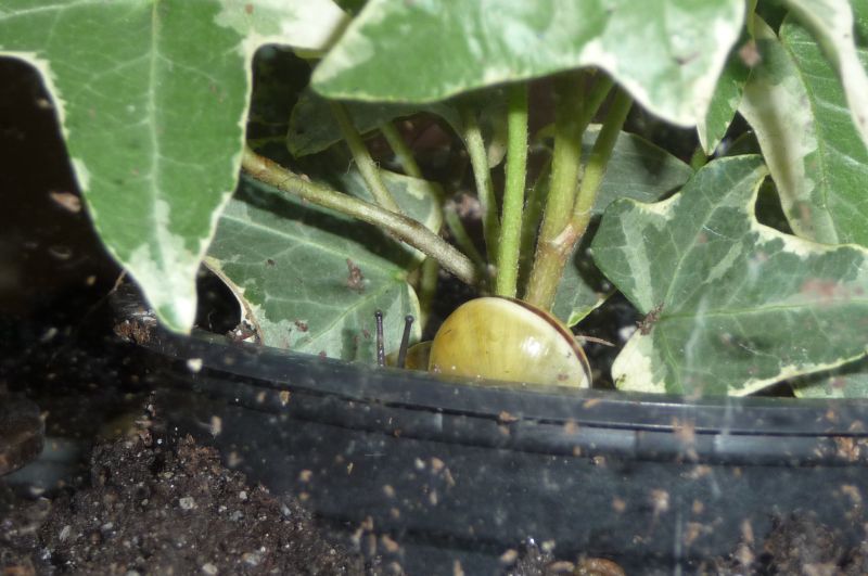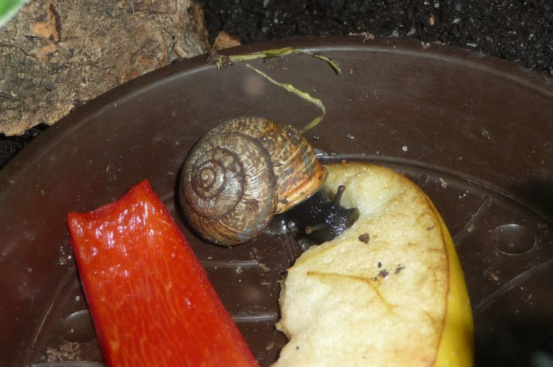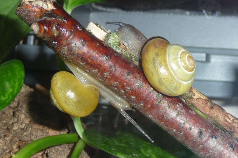 Eine der jungen Baumschnecken hat mal eben drei Wochen Sommerpause gemacht... in der Zeit hing sie am Deckel des Terrariums, während die Artgenossen munter umherschneckten und und vor allem: Fraßen! Jetzt ist sie wieder munter, aber man sieht, wieviel größer die andere Jungschnecke im Vergleich zu ihr geworden ist. Außerdem hat deren Haus einen schönen Rot-Ton bekommen.