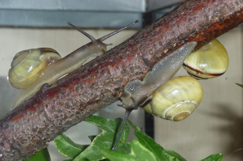 Die Kinder von Ernst sind gewachsen und bekommen teilweise Schnirkel am Häuschen. Als es einmal ein Stück Rinde mit Flechte zu Futtern gab, saßen einige nach dem Fressen zum Schlafen unter dem Rindenstück und hatten offensichtlich fleißig verdaut...