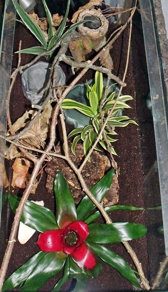 Big Mama ist sehr ruhig und schläft viel, was wohl das Alter mit sich bringt. Sie mag Bromelien, Farn und Orchideen.