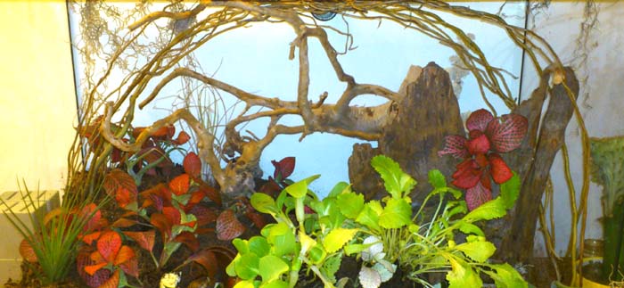 Derzeit hab ich irgendwie kein gutes Licht, aber ich hab das Terra jetzt ein bisschen aufgegrünt mit Salatpflanzen (klar... die roten Blätter da hinten schmecken wesentlich besser als das eigentliche Futter