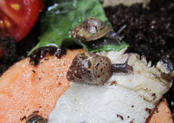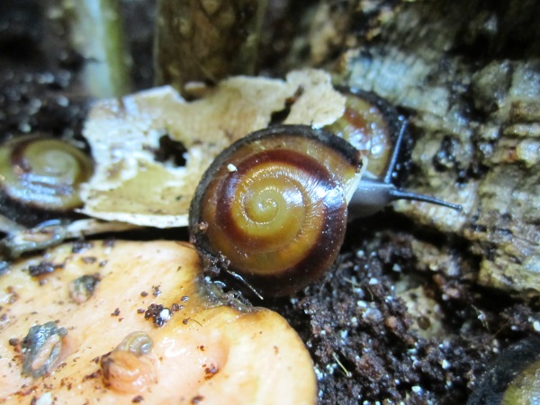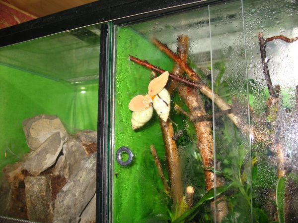 Es gibt auch noch andere Neuzugänge. Einmal sechs Caracolus sagemon. Sie sind tagsüber immer wieder am glupschen und noch etwas vorsichtig. Aber Nachts sind sie sehr aktiv und munter am Fressen. Anfangs hingen sie mehr unter den Ästen, und seit heute Morgen hocken sie nur noch im Futter