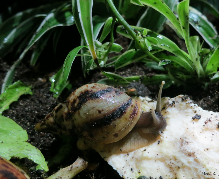 Der Kleine mittendrin. Er ist schon riesig gewachsen *g* und scheint sich inzwischen schneckchenwohl zu fühlen. Hier futtert er gerade die leckeren Löwenzahn, die ich auf dem Friedhof gepflückt habe (null Pestizide, null Rattengetier, ohne Hundekot und Urin, einfach nur lecka), frisch gewaschen und in der Salatschleuder schneckentauglich gemacht. Auch an den Sellerie isser rangegangen, kein Kostverächter - sehr schön.
