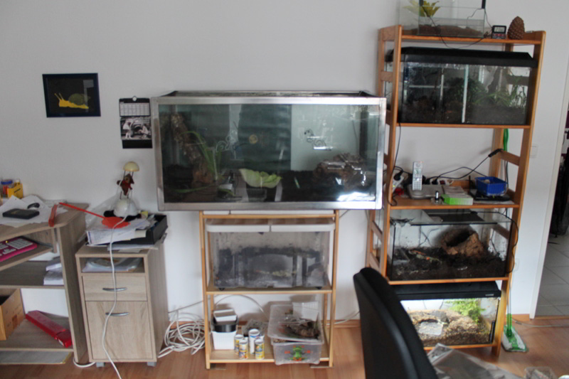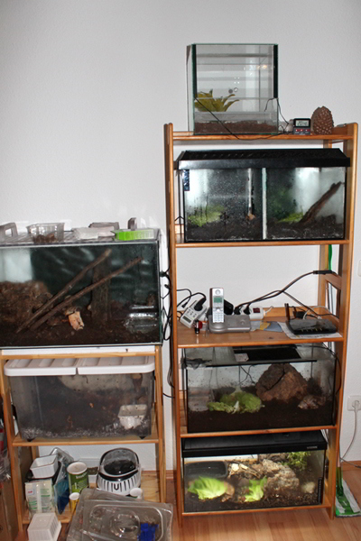 Ich will seit bestimmt 2-3 Jahren meinen Bestand verkleinern - habe Aquarien verkauft, damit ich nicht in Versuchung komme ... habe mir welche gekauft, um den Tieren platzmäßig gerecht zu werden, habe Tiere abgegeben, habe welche aufgenommen ... und nun hab ich die Regale - also meinen kompletten Platz, der mir zur Verfügung steht - wieder voll ausgeschöpft, damit der Nachwuchs auch in den großen Becken wachsen kann - schließlich sollen es mal Weltmeisterschnecken werden