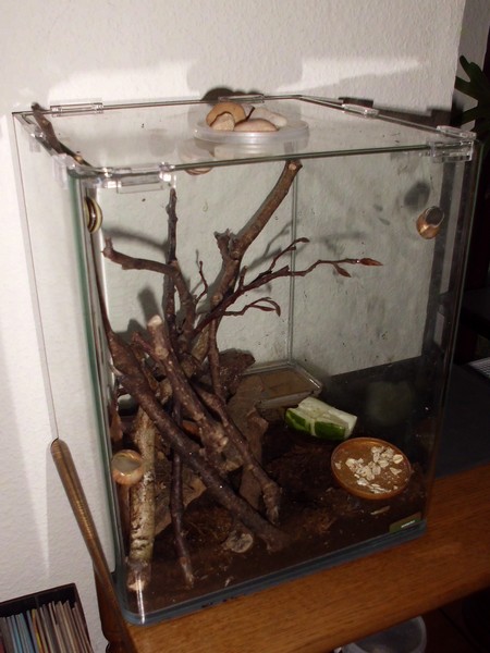 Im linken Bereich sind hauptsächlich die Kletterzweige, ein kleiner Laubhaufen, Borkenstücke und ganz hinten, auf dem Bild nicht zu sehen, Eierschalen. Rechts ist die "Jausenstation", im Moment Deckelchen mit Haferflocken, eines mit Gurke und ganz hinten die Badeschale, die auch durch Plazierung auf einem Borkenstück nicht immer vor dem Umkippen durch drunterkriechende Schnecken geschützt ist.