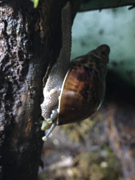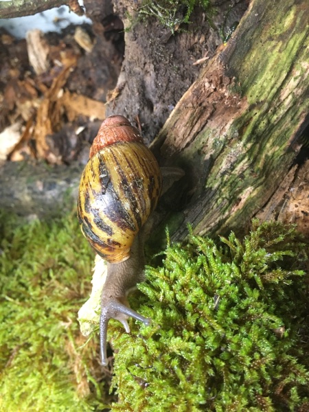 Tagsüber sitzen die Schnecken sehr gerne unter nassem Holz,nasse große Rindenstücke,Röhren und Kork sind ideal.Ebenso dicke Äste gerne schon etwas weisfaul.Damit sich die Feuchtigkeit im Holz gut hält ist es teilweise mit Moos abgedeckt.