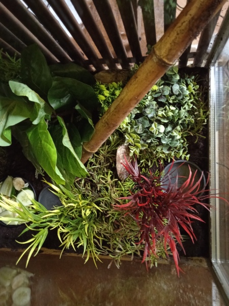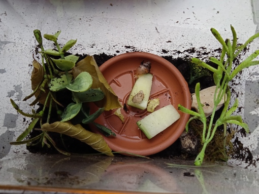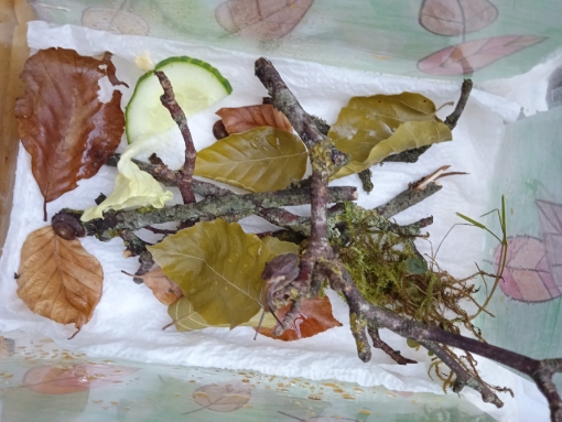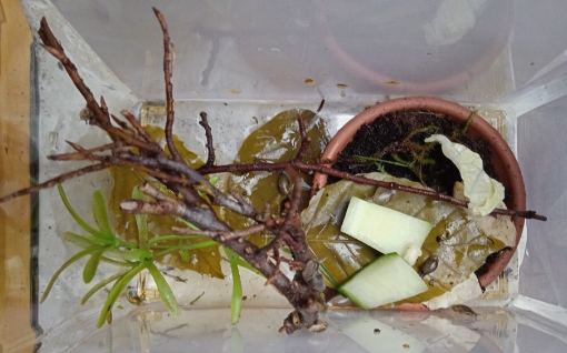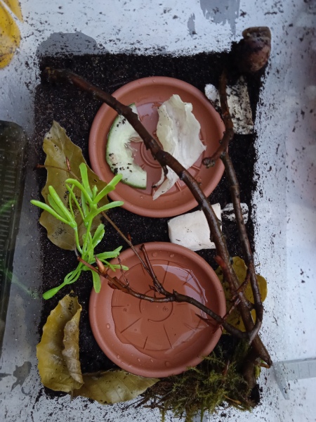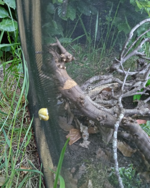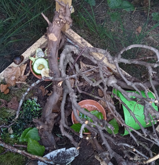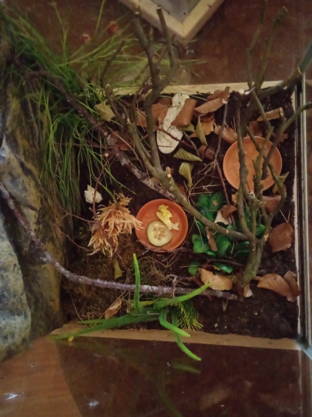 Ich hatte das Außengehege über dem Winter in einem Bauwagen der in unserem Garten steht. In dem Außengehege war noch etwas Erde vom letzten Jahr. Im Bauwagen waren Mäuse und irgendeine davon hat ein Loch ins Außengehege gemacht und Buchecker in der Erde vergraben. Um das gesamte Außengehege ist nochmal Fliegengitter, sieht man auf dem Bild kaum.