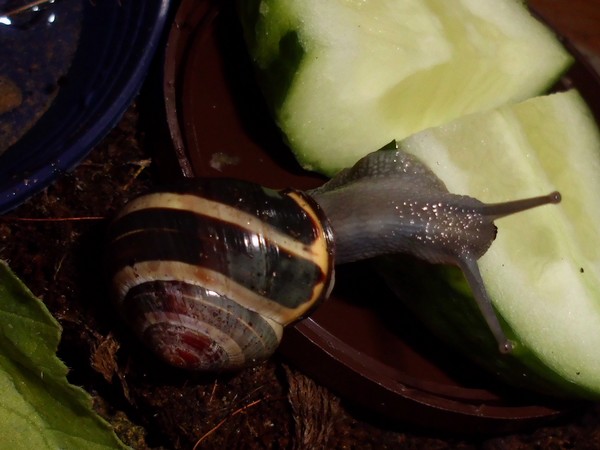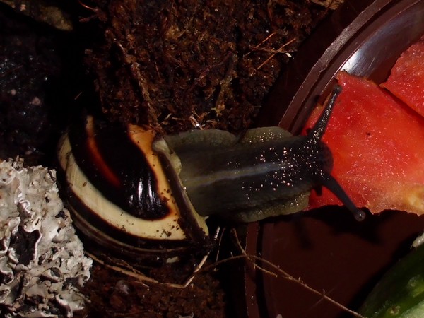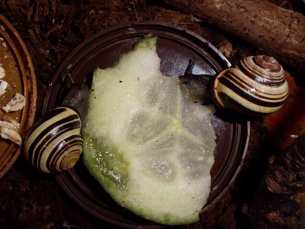Etwas über eine Stunde später muss dieser Schneck aber doch das Bad ausprobiert haben, bevor er sich die Schale der zweiten Gurkenhälfte vornahm.