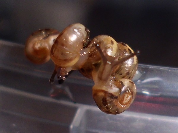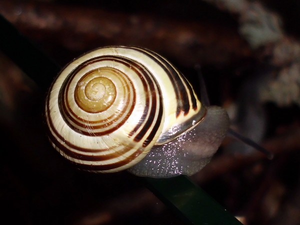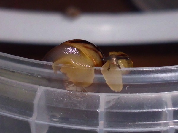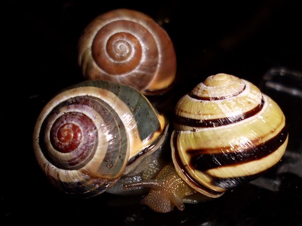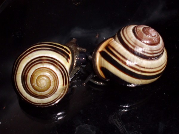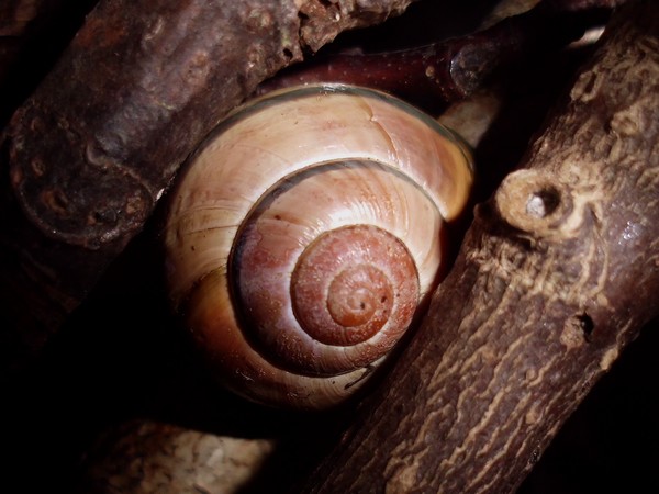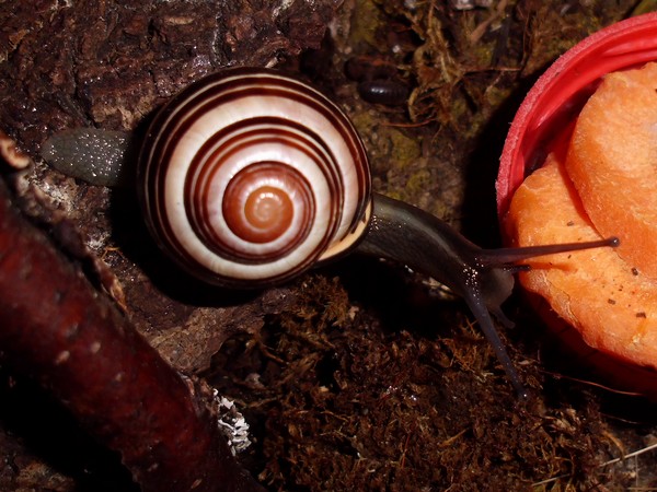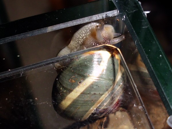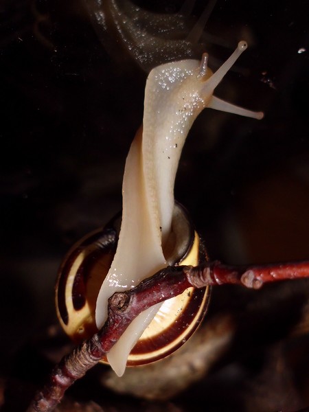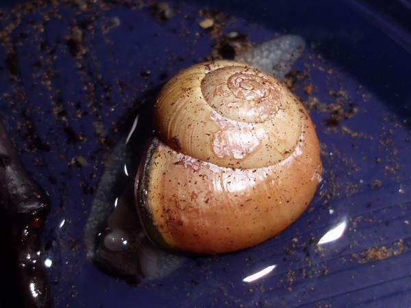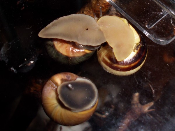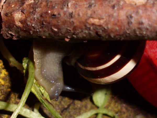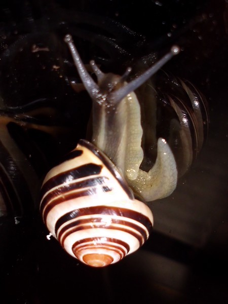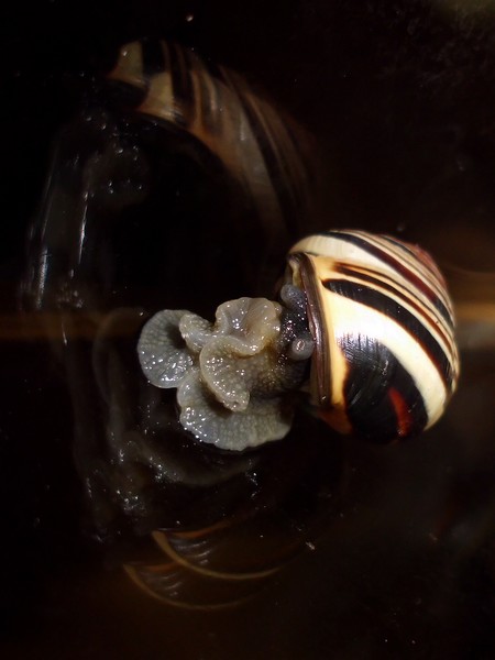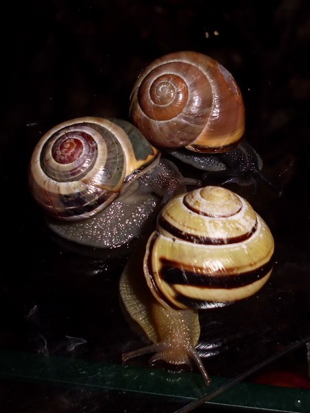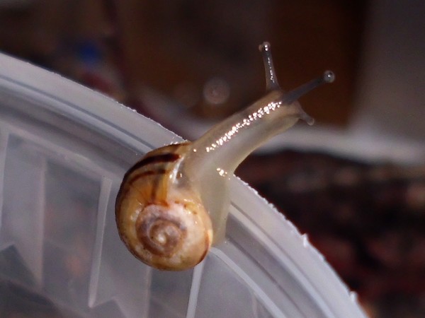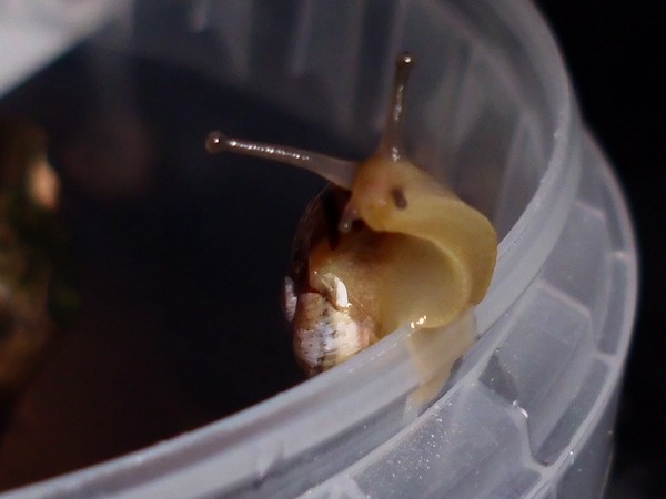 Sonntagmittag war mal wieder Schneckenheim-Putzen mit Eiersuche (nichts gefunden) dran. Die an Zweigen oder Blättern oder unter den Rinden klebten (und schlummerten), wurden mitsamt ihrer Unterlage in eine offene Dose befördert, die am Deckel mit demselben auf eine Dose gelegt, die an den Wänden schliefen, blieben, wo sie waren. Bei der ganzen Aktion wurden dann noch die Eingebuddelten eingesammelt, danach alles kontrolliert und gereinigt und wieder eingerichtet. Inzwischen war natürlich die halbe Bande munter; alle die ich zurück setzte. kontrollierten genauestens, ob die Zweige noch klettertauglich waren, und unternahmen Ausflüge zum und über den Rand, während ich versuchte, die drei von der Abdeckung dazu zu bewegen, auch wieder in ihr schönes sauberes Zuhause zu gehen. Der Deckel wollte ich ja schließlich auch noch säubern. Das gelang auch, und am Ende waren sogar alle Schnecks wieder dort, wo sie sein sollten.