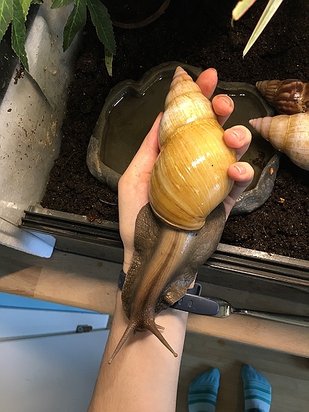 Wolke geht es in letzter Zeit leider wieder schlechter und ihr Fuß sieht dünn und verfärbt aus. Außerdem ist ihr Mantel einige Millimeter weiter nach hinten gerutscht. Allerdings frisst sie, ist aktiv und verhält sich normal, daher lasse ich sie leben. Nun ist nur ihr Gehäuse im hinteren Teil etwas instabil und es sind teilweise dünne Risse darin (2-3), deshalb habe ich den hinteren Gehäuseteil mit Leukoplast umklebt.