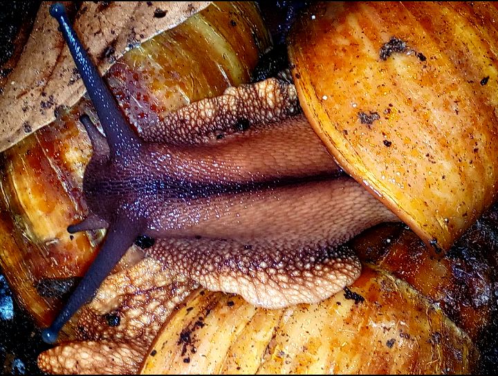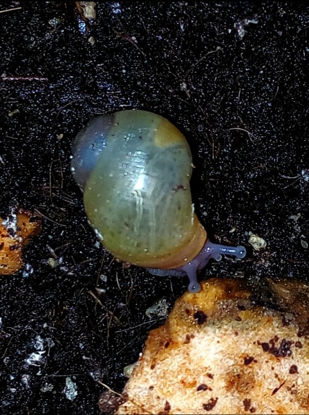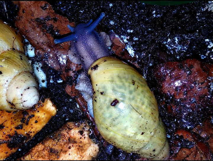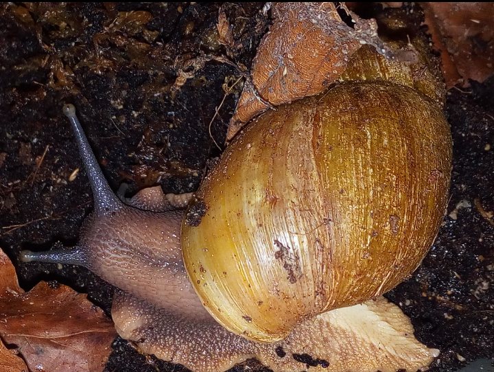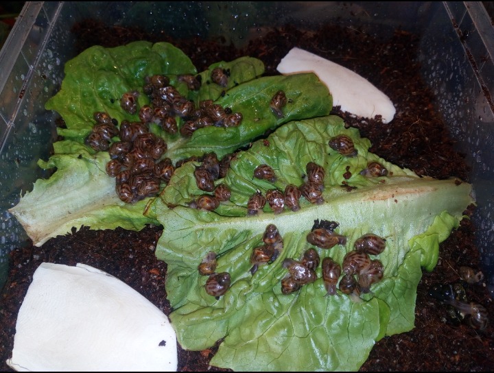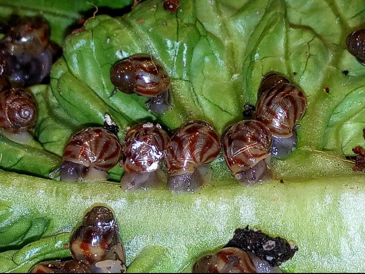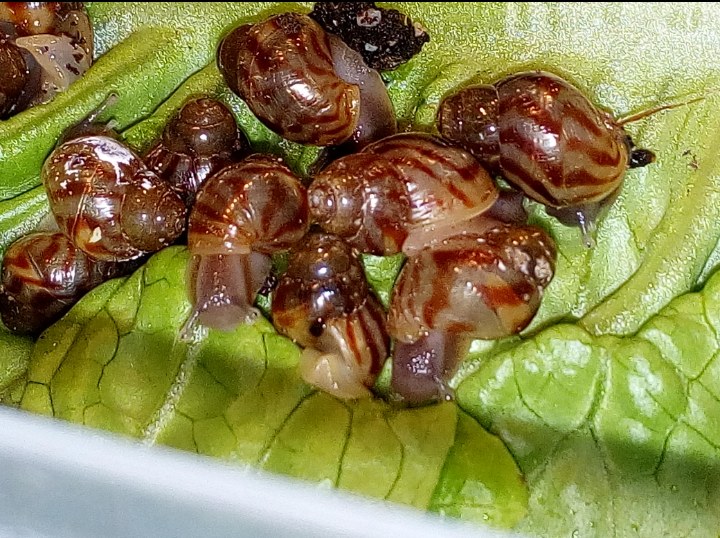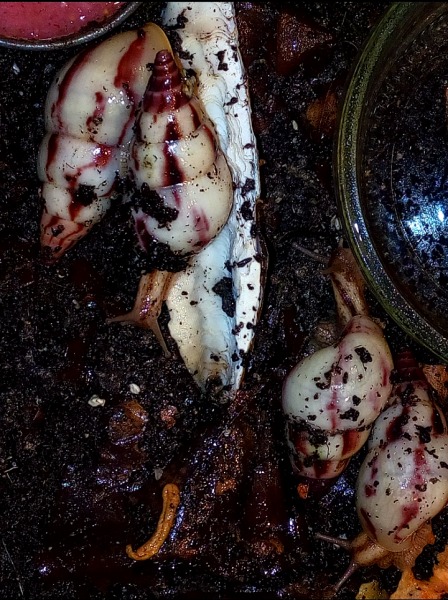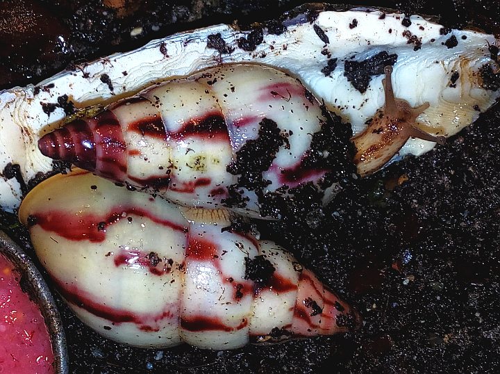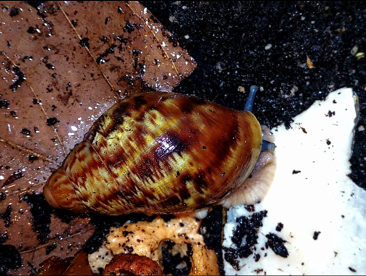 Meine wunderschönen wildfarbenen albopicta, Gehäuse 11 - 12 cm mittlerweile und frisch geschlüpfte Jungschneckis. Wieder müssen sie die bis kurz vor dem Schlupf mitgetragen haben, fast schon "Lebendgebährend"