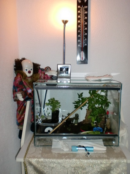 Was zum Futtern Petersilie, Dill etc. und eine flaches Tellerchen mit Wasser ist immer im Terra. Falls sie doch unerwartet aufwachen.