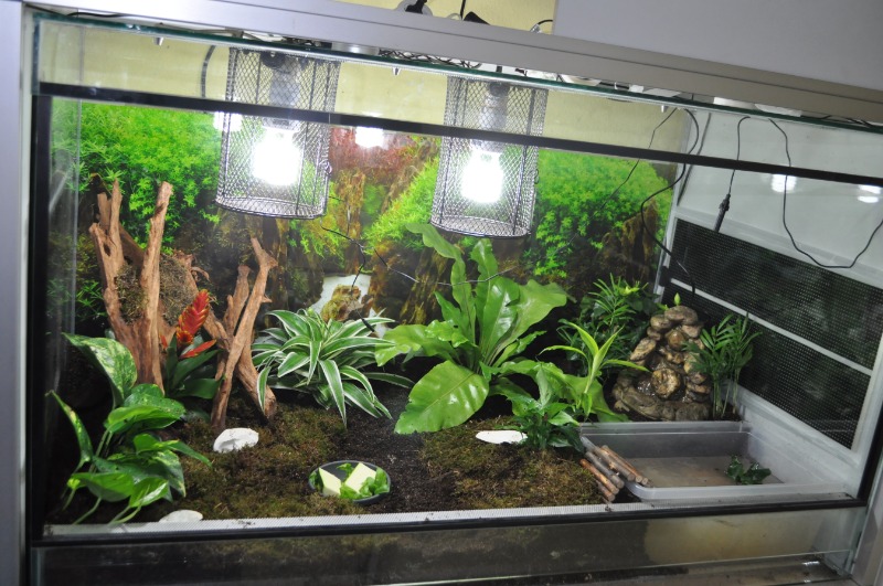 eeeendlich gab es ein großes Upgrade im Terra. Der verdammte Humus kam mit unendlicher Verspätung die Tage an, die Tageslichtbirnen und ein Brunnen kamen heute einen Tag zu früh - Juhu. Auf eine getrocknete Weinrebe und 2 Korkröhren warte ich allerdings noch. Ebenso auf die Abdeckung wo die Birnen reinkommen. Aber ich hab ja so oder so 2 Fassungen drin, also habe ich sie solange daran geschraubt. Zu der 20watt Heizmatte gesellt sich nun eine 35w Heizmatte. Plus Beleuchtung ( final 4 Birnen) hoffe ich, dass ich nicht mehr über die Raumtemperatur regulieren muss. Ich habe 2 Stunden nonstop Pflanzengeffummel hinter mir und bei Schneckentemperatur macht das keinen Spaß. Zumal ich eh keinen Grünen Daumen habe