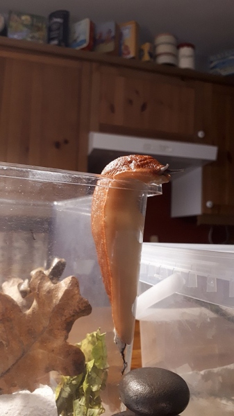 Nun muss ich versuchen elegant zu formulieren ohne blutrünstig zu wirken. Also, ich kam morgens runter und sah wie der kleine Horst versuchte durch einen Luftschlitz zu flüchten. Der große Horst wollte aber scheinbar nicht, dass er geht und hielt ihn am Schwanzende fest. Na ja, etwas zu fest, es fehlte schon ein Stück. Ich befreite den Kleinen sofort und schimpfte mit Horst. Leider war nichts mehr zu machen. Der Kleine verstarb recht schnell. Nun will ich es nicht noch mal versuchen. Horst ist wohl ein wenig gestört. Übrigens, ich sammle ein paar mal pro Woche alle Tiere vom Deckel der Biotonne und setze sie in meinen Garten, Schnecken, Asseln, Spinnen, Käfer, eben alles.