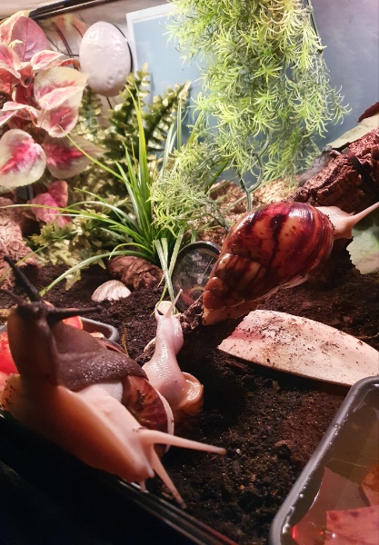 Aktueller Bestand 4x Achachatina marginata suturalis 4x Lissachatina Fulica 15x Cornu aspersum wobei ich nicht weiß ob die Jungtiere alle durch kommen und hier bleiben oder ein Teil ein neues Zuhause sucht.
