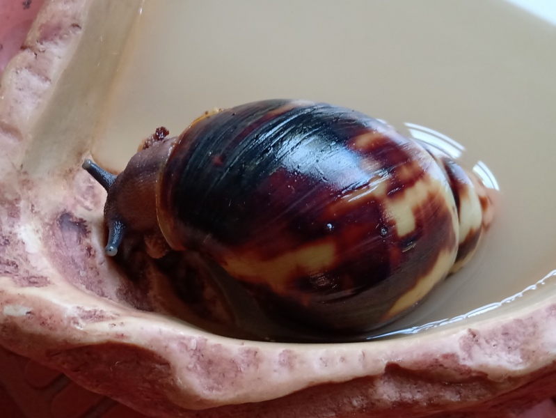Darin waren zwei neue Archachatina-Arten in jeweils zwei Farbformen. Die Kleinen haben ihre Reise gut überstanden und leben sich jetzt ein. Wenn ich Schnecken mit der Post bekomme, biete ich ihnen nach ihrer Ankunft zuerst ein Heilerdebad an, was bisher von den meisten auch gerne angenommen wurde.