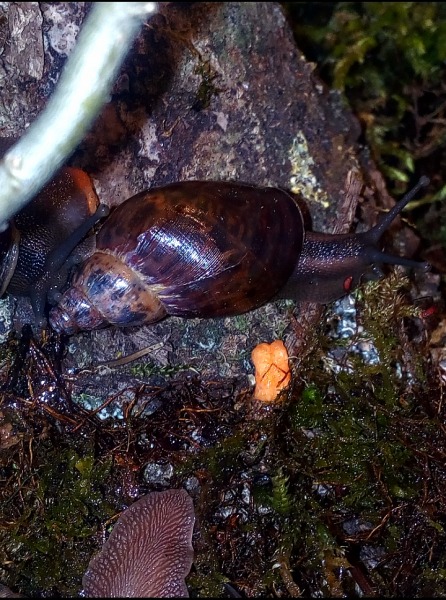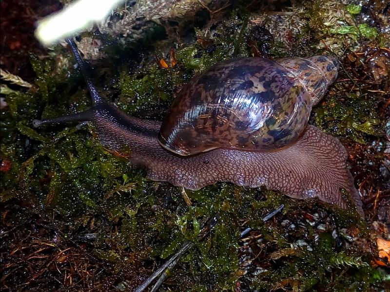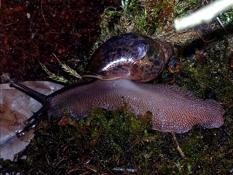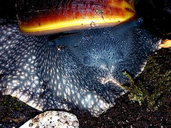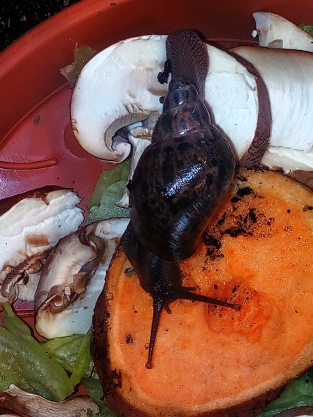 Hier eine wahre Schönheit, sie stammt von Sangmelima, südliches Kamerun. Vielen Dank an Susann. Nach langem hin und her überlegen ob ich es mit dieser doch nicht einfachen Art versuchen sollte, machte der Satz von Susann "wenn du Limis kannst, dann geht die auch" und das die F3 doch viel stabiler und nicht mehr so empfindlich ist den Ausschlag. Mein größtes Problem ist die Temperatur, da vor allem jetzt im Sommer die Temperaturen doch über 26 C liegen. Ich habe sie jetzt mit Grunzschnecken vor meiner Wohnungstür, da ist es jetzt doch noch bis 3 C kühler und momentan bei 24 C. Ich habe mir die Beiträge immer gerne von dieser Schnecke in Susann Galerie angeschaut und bereue es jetzt nicht sie genommen zu haben, mir gefällt das dunkle mit der dezenten Tüpfelzeichnung, was vor allem die Jungschnecken zeigen. Ich habe mir Susann´s Pflegetipps sehr zu Herzen genommen und viel Totfaules Holz, auch als Äste mit Moos und Flechten bewachsen, sowie Moos als Feuchtigkeitsspeicher auf dem Substrat. Sie können sich unter dem Holz und Laub verstecken, da sie Baumschnecken sind und den Boden nicht zum verbuddeln nutzen. Sie bekommen wie bei Susann zum normalen Angebot von Salat, Zucchini, Süßkartoffel, vor allem ihre Lieblingsfutter Pilze.