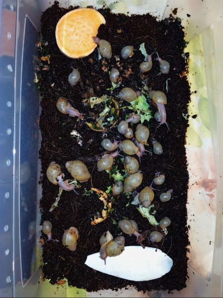 Von meinen Wildfängen habe ich die Jungschnecken abgesammelt, und die Drei waren sehr fleißig. Aus mehreren Gelegen waren es über 40 Jungschnecken. 7 habe ich für mich bei den Alttieren gelassen, der Rest ist nach dem absammeln in eine große Aufzuchtbox umgesiedelt. Sie sind schon hübsche kleine Murmeln mit einem schönen Körper. Die Häuschen auch schon richtig gelb.