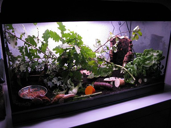 Das blaue Dingens, das man durch die Scheibe sehen kann, ist meine Sprühflasche, und in der Faunabox leben zur Zeit noch ein paar einheimische Winzschnecken. Ich schwanke noch zwischen drinnen behalten und vor dem Winter wieder auswildern...