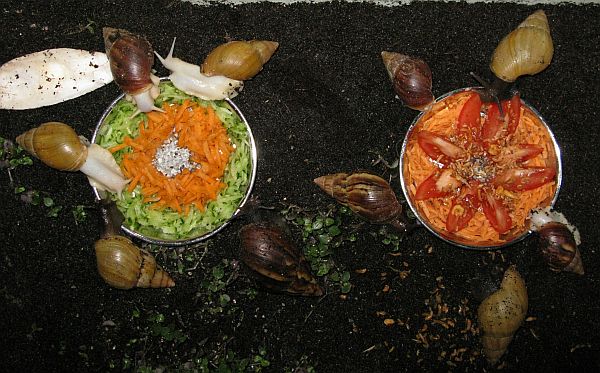 Tellertag, die ganze Bande gemeinsam am schnabulieren. Links gibt es Gurke mit Möhre und Vogelgrit-Topping, rechts ist Süßkartoffel mit Tomate und Gammarus im Angebot.