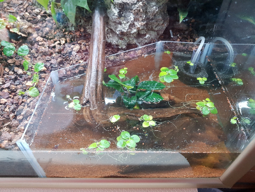 Bei der Einrichtung habe ich mich an der Machart meines damaligen Sutu-Beckens orientiert: Ganz unten ist eine dünne Schicht Lavagranulat als Drainage, obendrauf der Bodengrund bestehend aus Pinienrinde und Korkgranulat, natürlich alles gut aufgekalkt. Die Pflanzen sind wieder in Nylonsöckchen gesetzt, mit Seramis aufgefüllt und in den Bodengrund gepflanzt. Eine Besonderheit gibt es jedoch noch: Nachdem ich in Wassns Galerie gesehen habe wie gern Ovums baden und sogar tauchen hat das Becken auch einen Swimming-Pool bekommen