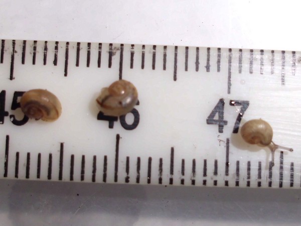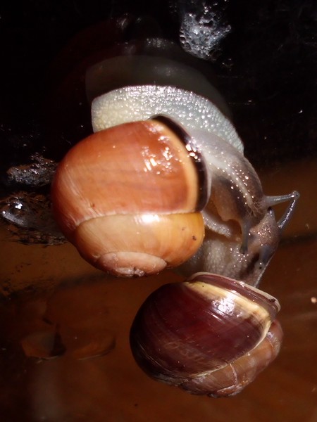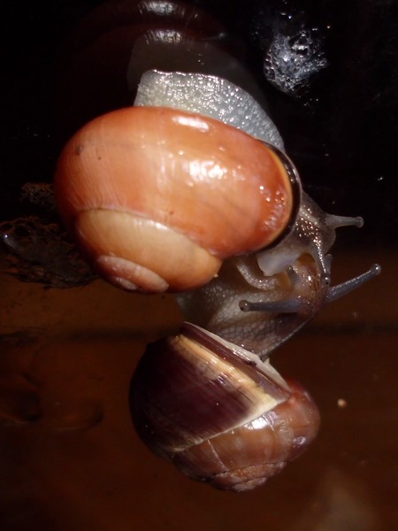 So, jetzt war es soweit, ich habe mal nachgeschaut, wo Rotschöpfchen abgeblieben ist. Also alle Zweige und Borkenstücke entfernen, Moos rausnehmen... Die beiden großen Zugedeckelten waren in ihren Ecken. In der Mitte dann das Gelege, das ich nun rausgeholt habe (rund 90 Eier). Wo aber steckt Rotschöpfchen? Blieb mir nur übrig, ganz vorsichtig Erdarbeiten vorzunehmen, und schließlich fand ich sie in einer Ecke eingegraben. Danach habe ich wieder alles eingeräumt, und kurz darauf wunderte ich mich, dass plötzlich drei Schnecken sichtbar waren: Rotschöpfchen fand wohl, dass sie nach der Störung mal nach dem Rechten schauen müsste.