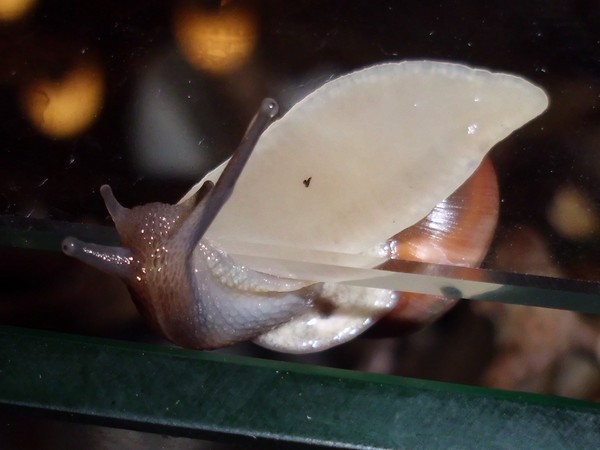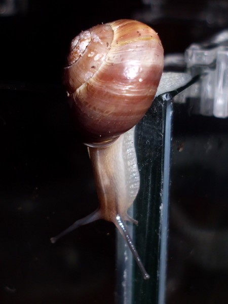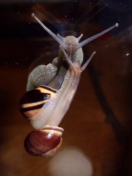 Oh Mann, hier wird ja das Unterste zu oberst gekehrt. Nix wie weg hier...Natürlich wollte er nicht wieder rein, aber schließlich konnte ich ihn austricksen, indem ich ihm einfach die Glasabdeckung in den Weg hielt, wo er dann leichtsinnigerweise raufkroch. Dann war es ganz einfach: Schneck am Deckel, Deckel so auflegen, dass Schneck sich drinnen befindet, fertig.