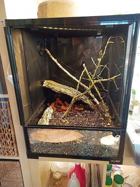 Papa Strolch hatte seit Einzug ins Terra durchgehend in einer Ecke oben angepappt geschlafen während ich mit der Luftfeuchte bzw. Trockenheit im Terra gekämpft habe. Schlußendlich habe ich oben mit Acrylplatte und seitlich mit durchsichtigem Paketband abgeklebt, dann blieb das Moos endlich auch mal über Nacht feucht. Nun habe ich das Klebeband an einer Seite zentimeterweise wieder weggemacht und mich so an die passende Öffnungsgröße für die richtige Luftfeuchtigkeit rangetastet.