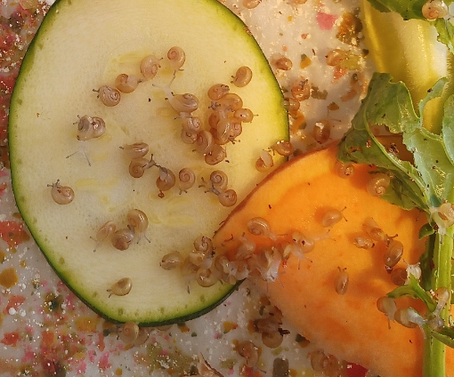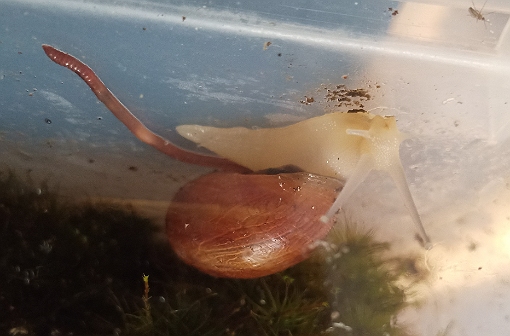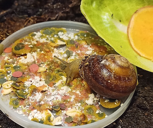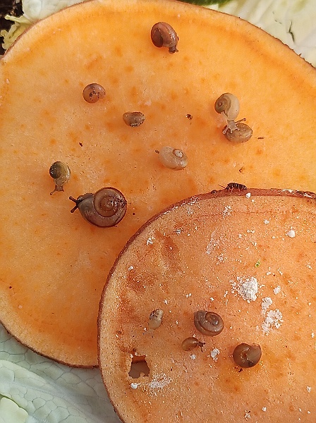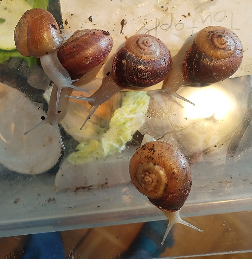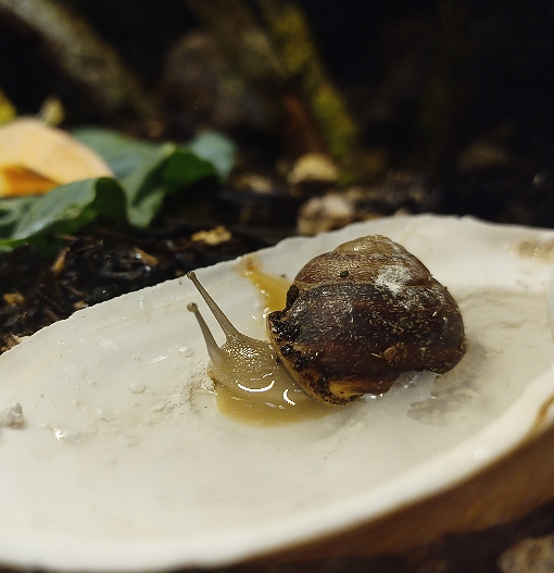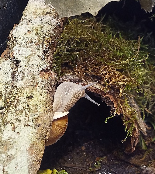 Die Gewächshausschnegel haben sich leider so explosionsartig vermehrt daß ich da massiv einschreiten mußte, super schade weil meine zwei recht blaß gezeichneten Alttiere da ein paar wunderschöne, kräftig braun getigerte Nachkommen hatten. Das Zusammenleben mit den Schnegeln war mit allen anderen Tieren völlig problemlos und ich bin eigentlich echt traurig daß es einfach wegen der vielen Nachkommen nicht klappt. Ich habe immer wieder genau geschaut wie die Schneckenarten untereinander reagieren, ganz oft kam es vor daß Schnegel und Otala Kopf an Kopf am gleichen Futter nagten. Bei Begegnungen waren es immer die Schnegel, die ganz höflich Platz gemacht haben.