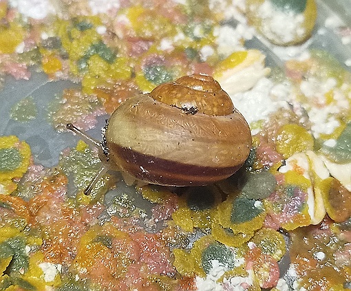 Mein merkwürdiges Bänderschneckle (das ich anfangs für eine Helix gehalten hatte, da es einfach braun war) hat immer merkwürdigere Farben, oben von Braun zu Rosa verfärbt, mittig Gelb und unten zwei breite dunkle Streifen. Aber es wächst inzwischen munter und ist nach der Sommerruhe wieder aktiv. Die anderen Bänderschnecken hatten nun bis auf zwei sehr lange Sommerruhe gehalten, vergraben und verdeckelt, sind jetzt aber mit dem Regen auch alle wieder aufgetaucht und haben sich offenbar auch gepaart.