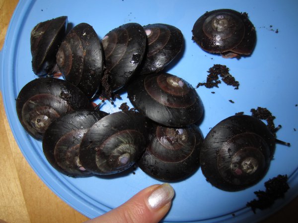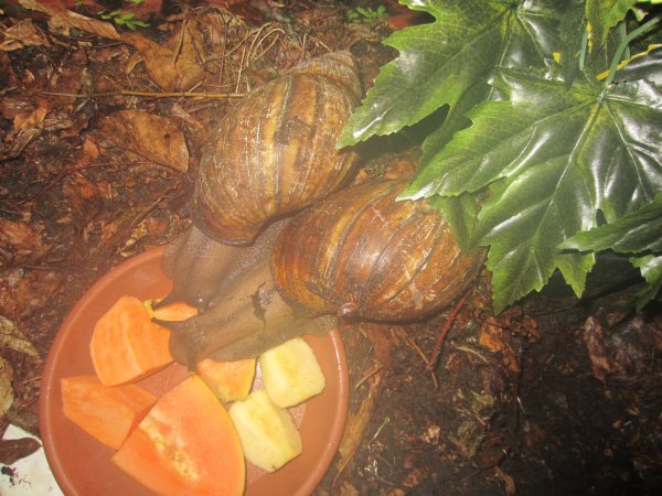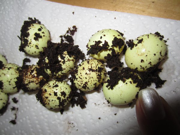 Vor etwas mehr als 3 Monaten etwa fand ich beim Terraumbau zufällig zwei schöne Gelege, mit 9 und 10 schön großen Eiern...aus denen sich leider gar nichts entwickelte. Als ich diese Gelege nach 6 Wochen entsorgte, fand ich ein weiteres Gelege, nochmal 10 schöne große Eier. In diesen entwickelten sich Schnecks, die leider mit einer Größe von 1,5cm Durchmesser in den Eiern abstarben. Als das Gelege zu riechen anfing habe ich es entsorgt und gleich das nächste gefunden: 11 hübsch große Eier. Leider ließ sich gut 20 Tage später ein Bodengrundwechsel nicht vermeiden, so dass ich auch das Gelege herausnehmen musste. Gaaanz vorsichtig, ich habe versucht, die Eier dabei nicht zu drehen, sie warm gehalten und später an gleicher Stelle wieder vorsichtig eingesetzt. Ein Ei habe ich geöffnet, darin eine ca. 0,7cm große Schneck. Jetzt bete ich, dass trotz Bewegen doch noch etwas schlüpft.