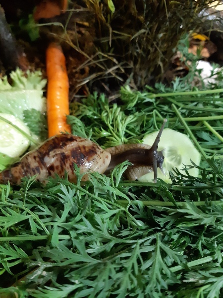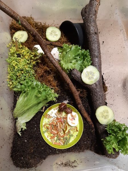 Nee, im Ernst. Sie bekommen viel Futter. Eigentlich viel zu viel... Kalk in Form von selbstgemachten Kalkblock in Stückchen und Sepiaschale in Stücken. Gelegentlich streu ich etwas Sepiapulver übers Futter. Natürlich auch mal Gammarus und Achatinasticks