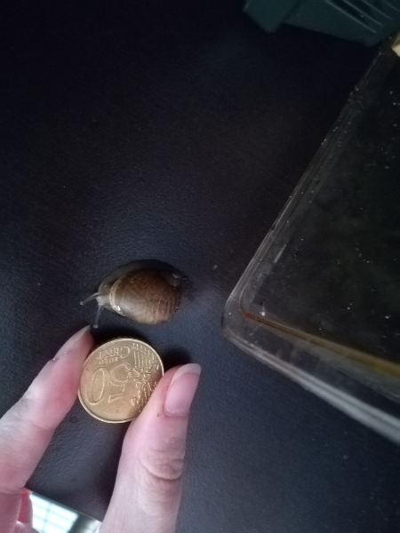 so das kleine Schneckerl schneckt noch ganz frei herum und ist äusserst neugierig, ich versuche übergangsweise ihm die Freiheitsliebe soweit zu ermöglichen, ohne das es mir wieder vielleicht sonst wohin verschwindet, bis ich meine wohnung umgeräumt und ihm ein geeignetes heim darin machen kann.