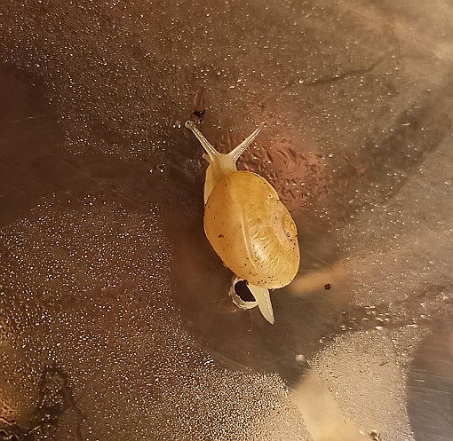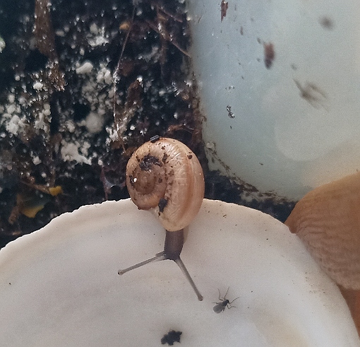 Sie war ein Beifang in der gekauften Walderde, kam als ganz kleines Schneggle hier an und ist inzwischen ordentlich gewachsen. Sie ist immer wieder mal zu sehen, auch mal morgens, ist extrem gemütlich unterwegs und liebt ihre Badeschale. Sie unterscheidet sich aber deutlich von den anderen gelben Exemplaren, es müssen wirklich zwei verschiedene Arten sein.