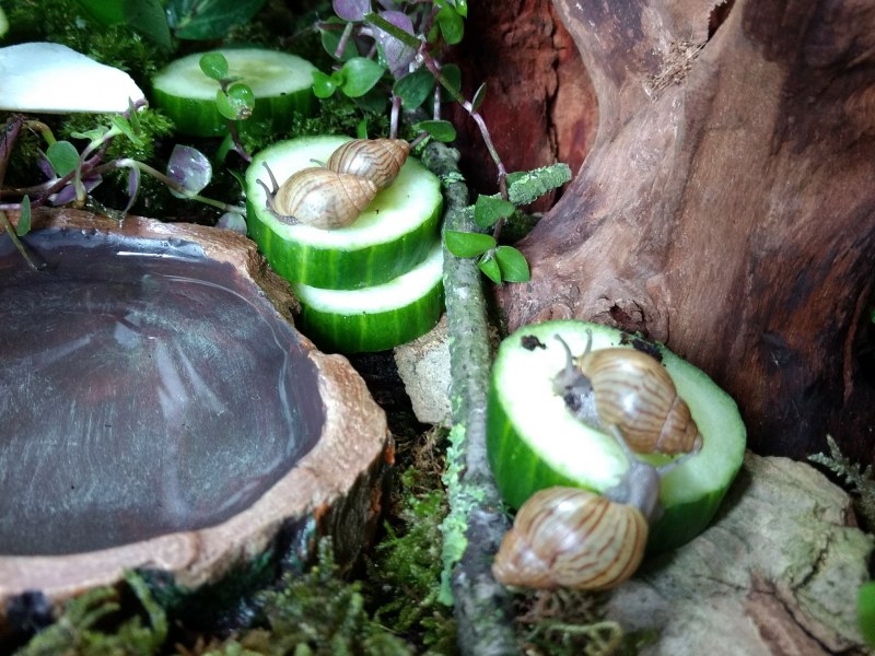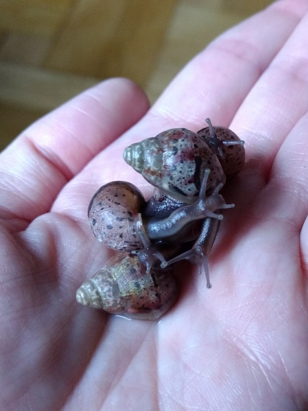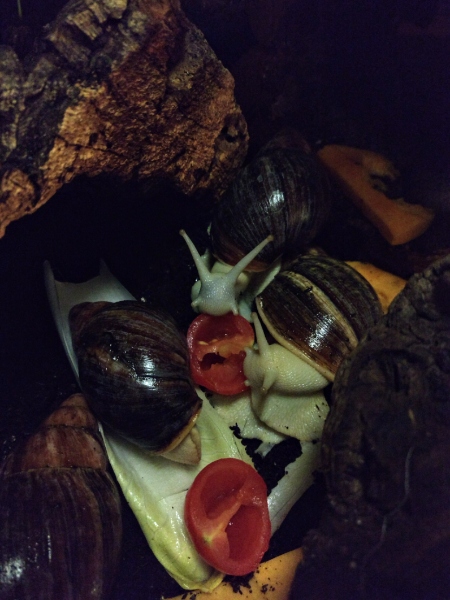 Da sich einzelne meiner Bänderschnecken in den vergangenen Wochen immer mal wieder verdeckelt haben, versuche ich, sie auf einen Winterschlaf einzustimmen. Sie sind in eine große Faunabox umgezogen, die momentan bei uns im unbeheizten Wintergarten steht. Ich bemühe mich, sie wenig zu stören und gebe nur noch alle 2-3 Tage frisches Futter hinein und sprühe kurz. Einige sind noch wach.