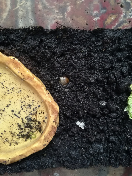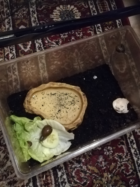scheint ihnen gut zu gehen. zwei seichtere bademöglichkeiten sind gegeben, erde ein wenig flach aber weiter hinten noch eine größere box mit genug erde zum tief buddeln. Kresse sieht man, sie wurde soweit angeschneckt aber man sieht...salat vor XD