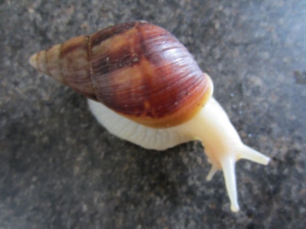 Auch Schnecken...gut 100 kleine Fulis und eine mir unbekannte Art, die ich sehr hübsch fand, aber als Wildfang nicht kaufen wollte. Eine Woche später war ich wieder in dem Laden, die Schnecks lagen weit eingezogen und knochentrocken mit welkem Salat in einem Spinnenwürfel.Auf Nachfrage erfuhr ich, dass diese Schnecks nur aus Versehen in diesem Laden gelandet waren...eigentlich waren Wasserschnecken bestellt, die auch "Baumschnecken" genannt werden.Die Sammler haben es aber allzu wörtlich genommen und einfach Schnecks von Bäumen abgepflückt. Laut Aussage des Lieferanten kamen die Tiere aus Sulawesi,Indonesien.Die Art ist unbekannt, auch "Wissenschaftler" würden sie nicht kennen.Seit Ankunft in der Zoohandlung hatten sie nicht gefressen und sich immer weiter zurückgezogen.Ich wies daraufhin, dass ich keine Schnecke kennen würde, die es knochentrocken mag, worauf ich zur Antwort bekam, dass sie es naß aber auch nicht mögen. Ich nahm die 2 Tiere mit,die mir noch am fittesten erschienen.Schon auf dem nassen Zewa auf der kurzen Heimfahrt fuhren sie zu voller Länge aus.Hier im Forum bekam ich den Tip, dass es sich um Hemis handelte, bei weiteren Recherchen blieb ich an Hemiplecta humphreysiana hängen...genau steht das aber bislang nicht fest...wer also noch was weiss