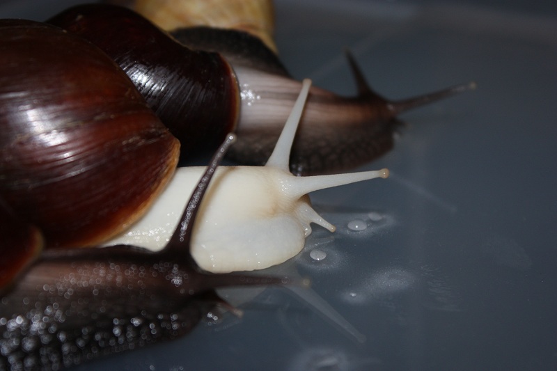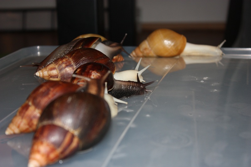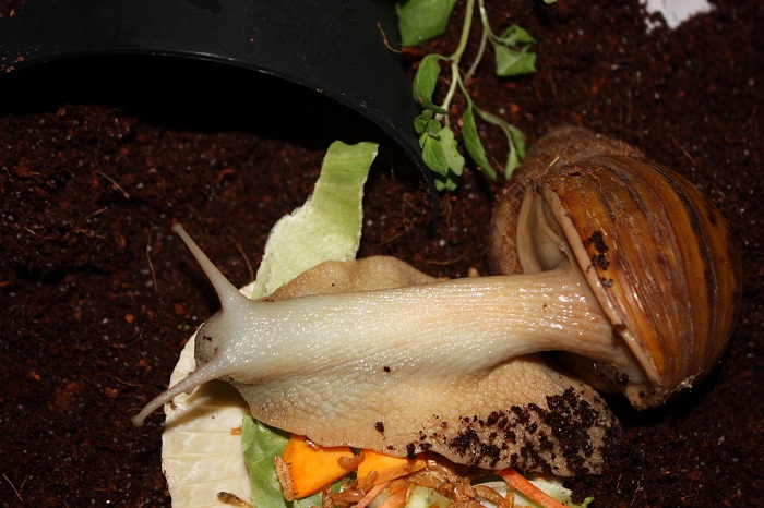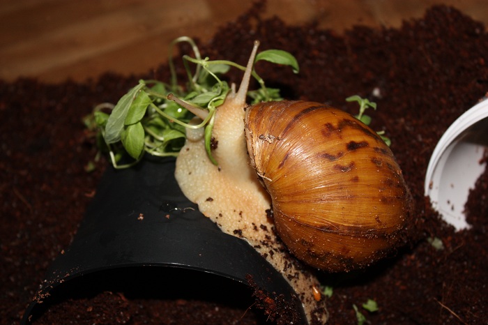 Gibt es ja gar nicht! Nachdem ich sie lange Zeit auf der Hand hatte und die Schnecke jeden Millimeter meiner Haut inspiziert hat, habe ich die Hand flach auf die Erde gelegt, um sie runterkriechen zu lassen. Und was macht sie? Rennt in Richtung Napf und schlägt sich die Wampe voll!! Huch!?