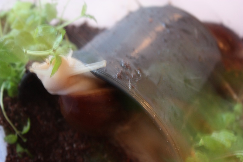 ?Aber jetzt kommt es: Schnecke Nummer zwei, meine kleine Elfe, war zuvor auch in Winterruhe (allerdings ohne Deckel). Als sie heute kam, rührte sie sich aber schon vorsichtig und schaute wie eine kleine Schildkröte aus ihrem Häuschen heraus...