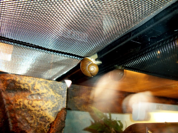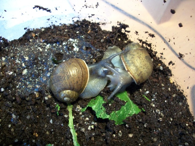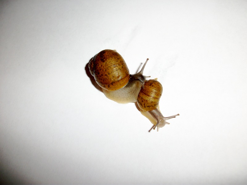 Hier sind sie sich in einer Umzugsgefäss nahe gekommen gleich kurz vor dem Wechsel zu einem neuen Terrarium. Und leider auch kurz vor dem Tod der jüngeren Grunzschnecke.