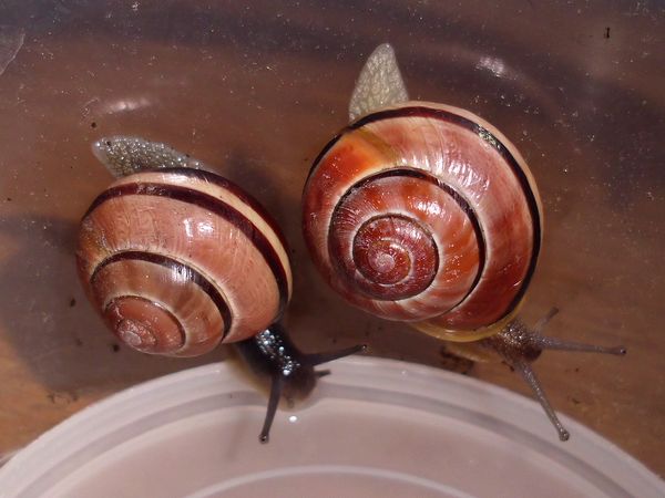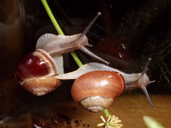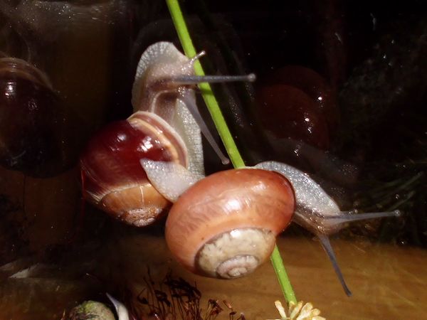 Dann beherberge ich im Moment vier erwachsene Schließmundschnecken, interessant zu beobachten, ich wollte sie einfach mal näher kennenlernen (wie ich mich auch sonst mit vielen Krabblern befasse, die meinen Weg kreuzen). Dass die mir eine kleine Baby-Schwemme bescheren, weil sie lebendgebärend sind (und eine Eiersuche daher erfolglos), damit hatte ich natürlich nicht gerechnet. Die Schlingel werden demnächst wieder in ihre natürliche Umgebung kommen. Aber putzig sind die Kleinen allemal, und sicher auch hier interessant, mal ein bisschen von der Entwicklung mitzubekommen. Bei ihnen sind außerdem noch zwei kleine Schnirkels untergebracht.