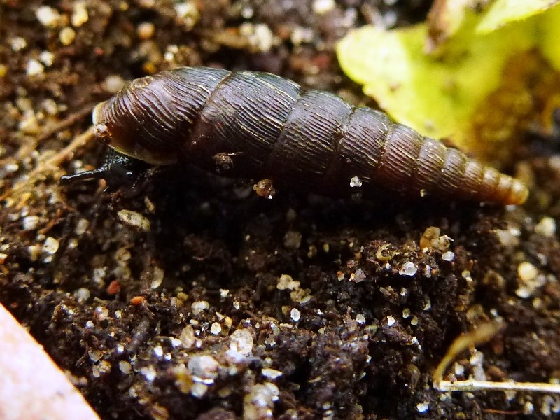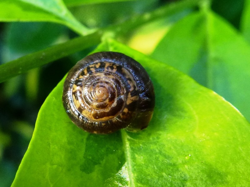 Darf ich vorstellen: Eine spitze Baumschnecke! Sie saß neben all den anderen Baumschnecken. Ich hoffe nun sehr, dass diese offenbar mutierte Gehäuseform genetisch vererbbar ist.