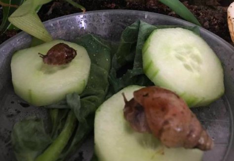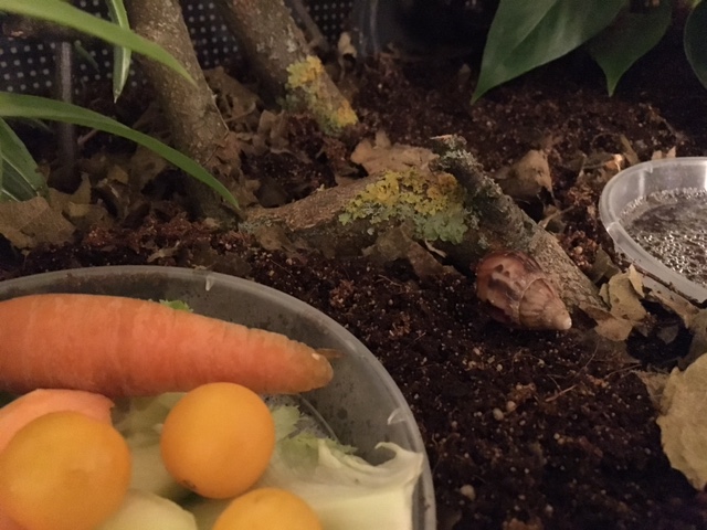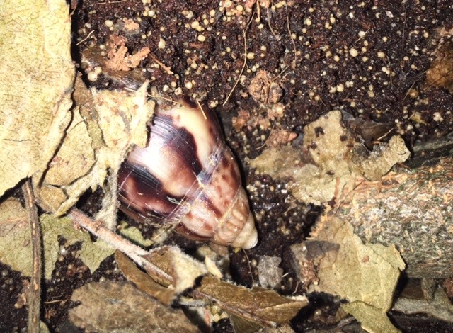 Unsere Perlen entwickelten sich rasend schnell zu richtigen Schneckerl und sind heute nach 2 Monaten schon 2,5, 3 und 3 Zentimeter groß. Seit zwei Wochen leben sie nun auch nicht mehr im Faunarium (Für die Heimchenbox waren sie schnell zu klein) sondern schnecken schon munter durch Terrarium. 2 der 3 sind (nun endlich echte