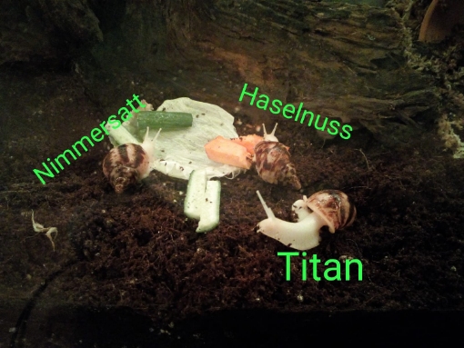 soll aber so aussehen wie die Jungschnecken (geschlüpft Mitte Juni 2018).Hier nun ein Gruppenbild der 3, die Namen hat mein Sohn (4 Jahre alt) ausgesucht