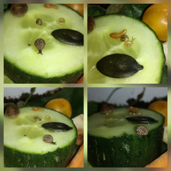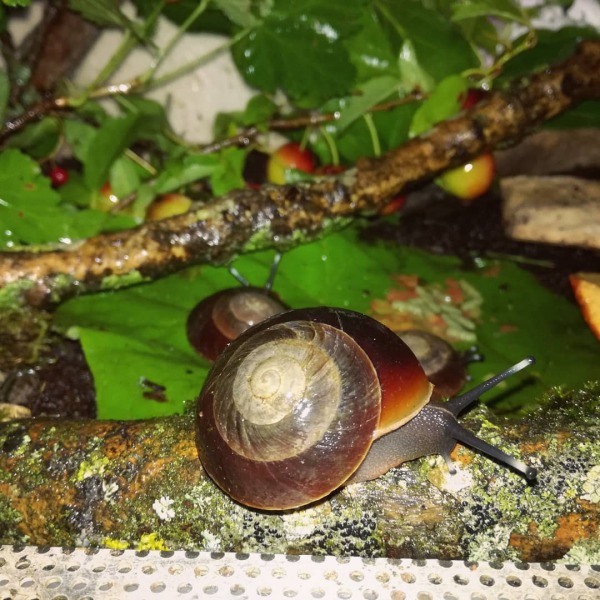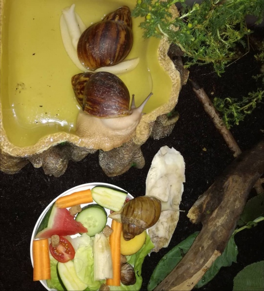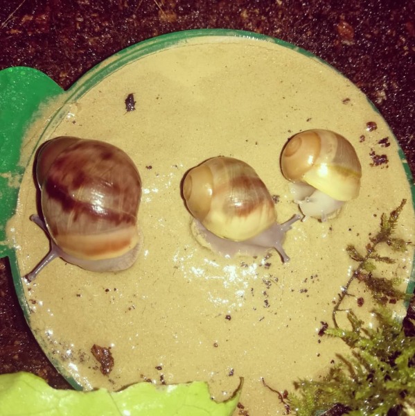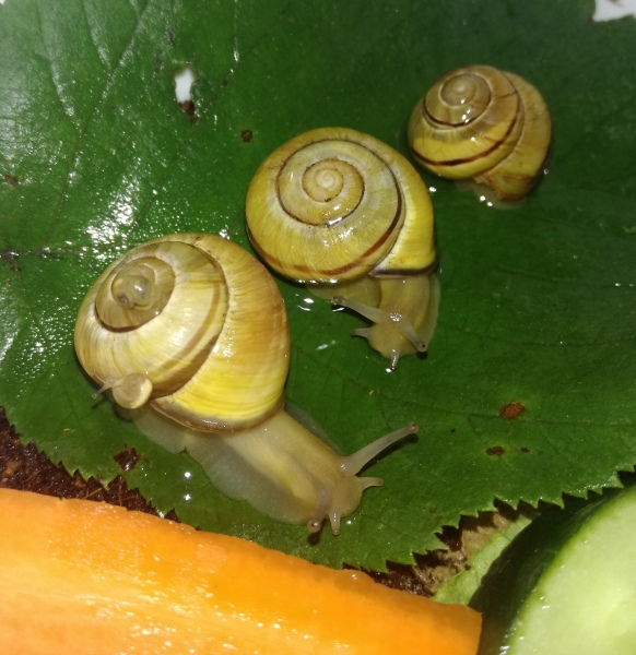 Vor einem guten Jahr sind zuerst Norma (Albino, gelbes Haus) und Norman (der Winzling im Futter) eingezogen. Sie stammen aus wahrscheinlich nicht ganz so guter Haltung und hatten schon leichte Häuschenschäden bei der Ankunft, und 3 Wochen später wären sie mir bei der Hitzewelle fast gestorben. Norma's Häuschen war schon fast leer und ich hätte nicht gedacht dass sie sich erholt, aber Heilerde, Thymiantee, Kokosöl und viel kühles Laub hatten dann scheinbar doch geholfen. Seitdem wachsen sie allerdings nicht mehr so schön und besonders der kleine Norman hat einen Baufehler den er nicht korrigiert bekommt, er ist trotzdem munter, aktiv, frisst, hat teilweise aber einen leichten Mantelvorfall wenn er zuviel frisst..Ich überlege nun ob ich nicht mal zum Exoten Tierarzt fahre und die eine Idee haben wie man ihm helfen könnte. Ich bekam schon den Tipp dass man es evtl mit einer chirurgischen Feile korrigieren könnte.