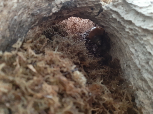 Inzwischen habe ich das Moos in der Ecke ein bisschen aufgestockt und noch eine zweite Sepiaschale dazugelegt. Die erste ist fast abgeraspelt :) Im Hintergrund ist die Heizmatte, das Stück Holz dahinter klemmt de Matte zwischen Wand und Terrarium ein, damit mir nicht so viel Wärme verloren geht.