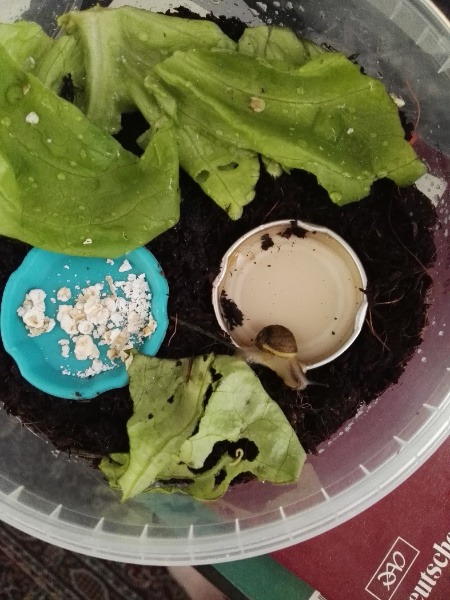 die Erde, geklauterweise von meinen Hasen genommen, etwas Wasser und eben was zu fressen, wo ich las das Haferflocken der Hit wären...joah gefressen hat sie die, aber oft schneckte sie darüber und guckte eben was es sonst gab. Man merkt meine Not ich hatte in dem Moment sogar nur ein leeres Eierfach.
