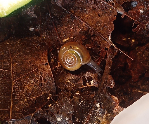 Total winzig, mit vorne weit abgebrochenem Häuschen. Draußen wars Winter, also mußte sie bleiben. Mit ihr zusammen saßen noch 3 kleine Nacktschnecken im Wirsing.