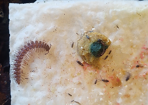 Als Bodenpolizei habe ich eingesetzt 2 Regenwürmer, einige Tausendfüßer, Asseln und Bandfüßer (meine Lieblinge, Würfelchen genannt weil sie aussehen wie eine Kette aus kleinen Würfelchen). Der Rest der Bewohner kam mit dem Laub und Moos mit, nicht unbedingt alles willkommen...
