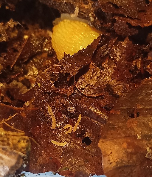 Zum Glück hatte ich mich da schon etwas genauer informiert (eigentlich um Tausendfüßer und Asseln zu halten) und so war diesmal schnell der Plan für eine hoffentlich besser funktionierende Unterbringung mit einer ordentlichen Säuberungstruppe im Boden gereift - Wald- und Kokoserde, verrottendes Laub, Moos, faules Holz, Flechtenäste, dazu Sepia als feste Kalkquelle und Futterkalk überall beigestreut.