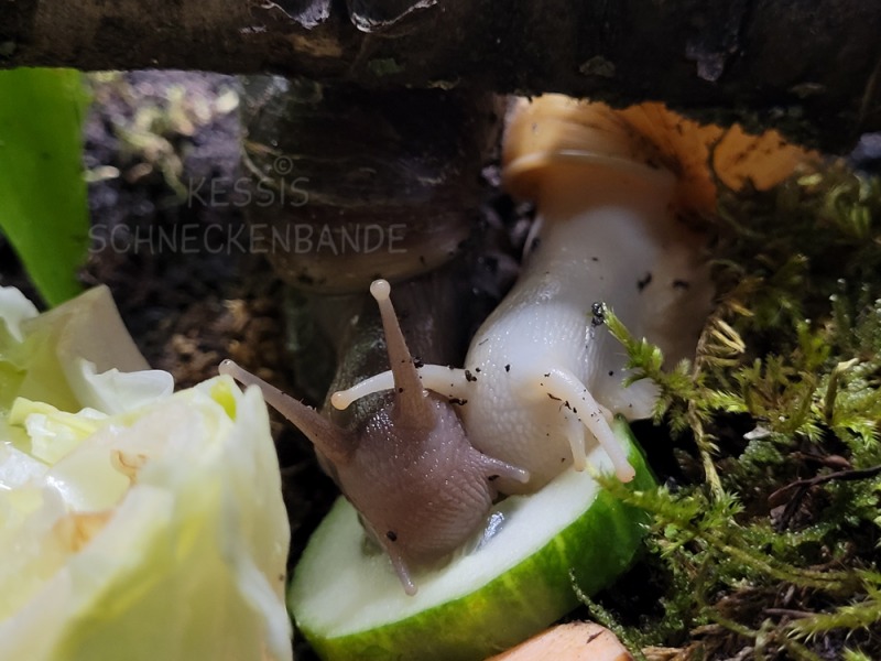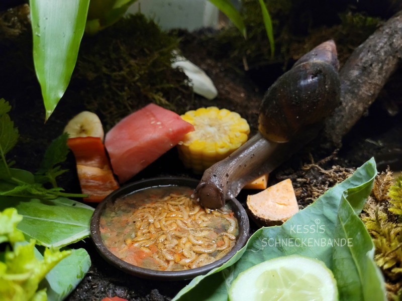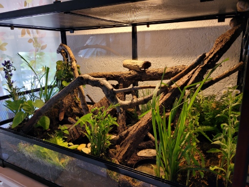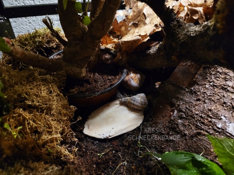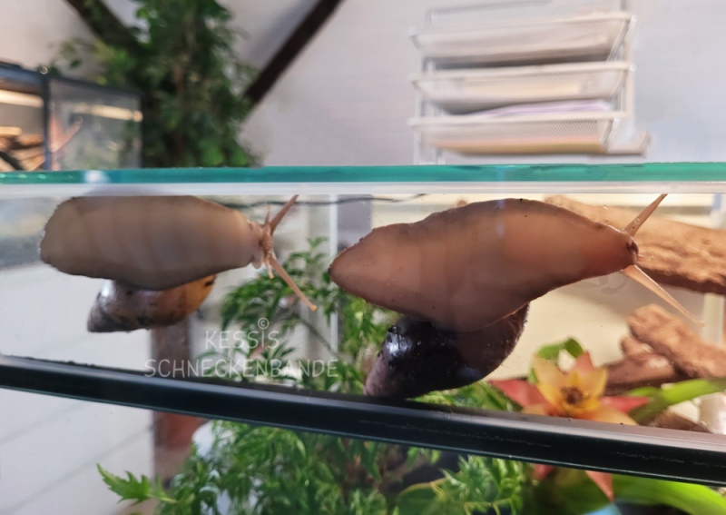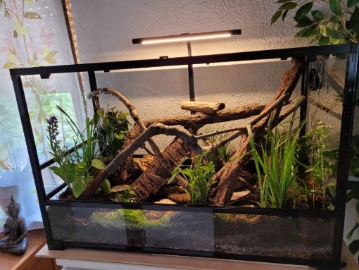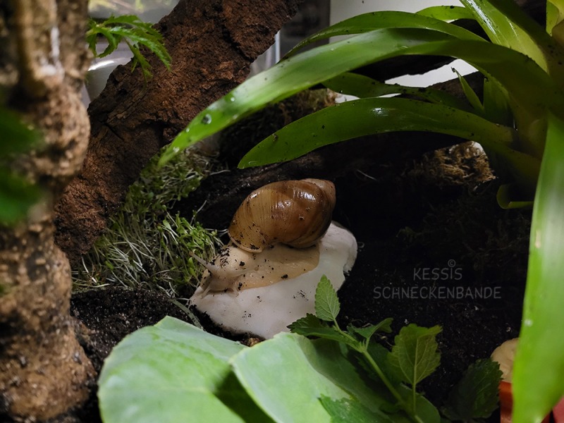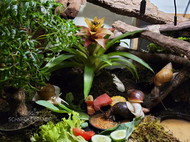 Die Pflanzen halten sich nun schon seit Anfang Mai (am 10.05. sind die Schneckis eingezogen) und keine ist seitdem zerlegt worden... sie lieben das Bäumchen und klettern fleißig dran rum (das die Schneckerei wiederum großzügig verzeiht und wächst und wächst und fast schon die Terrariendecke erreicht hat. Ich schätze, ich muss ihn demnächst ein bisschen cutten...